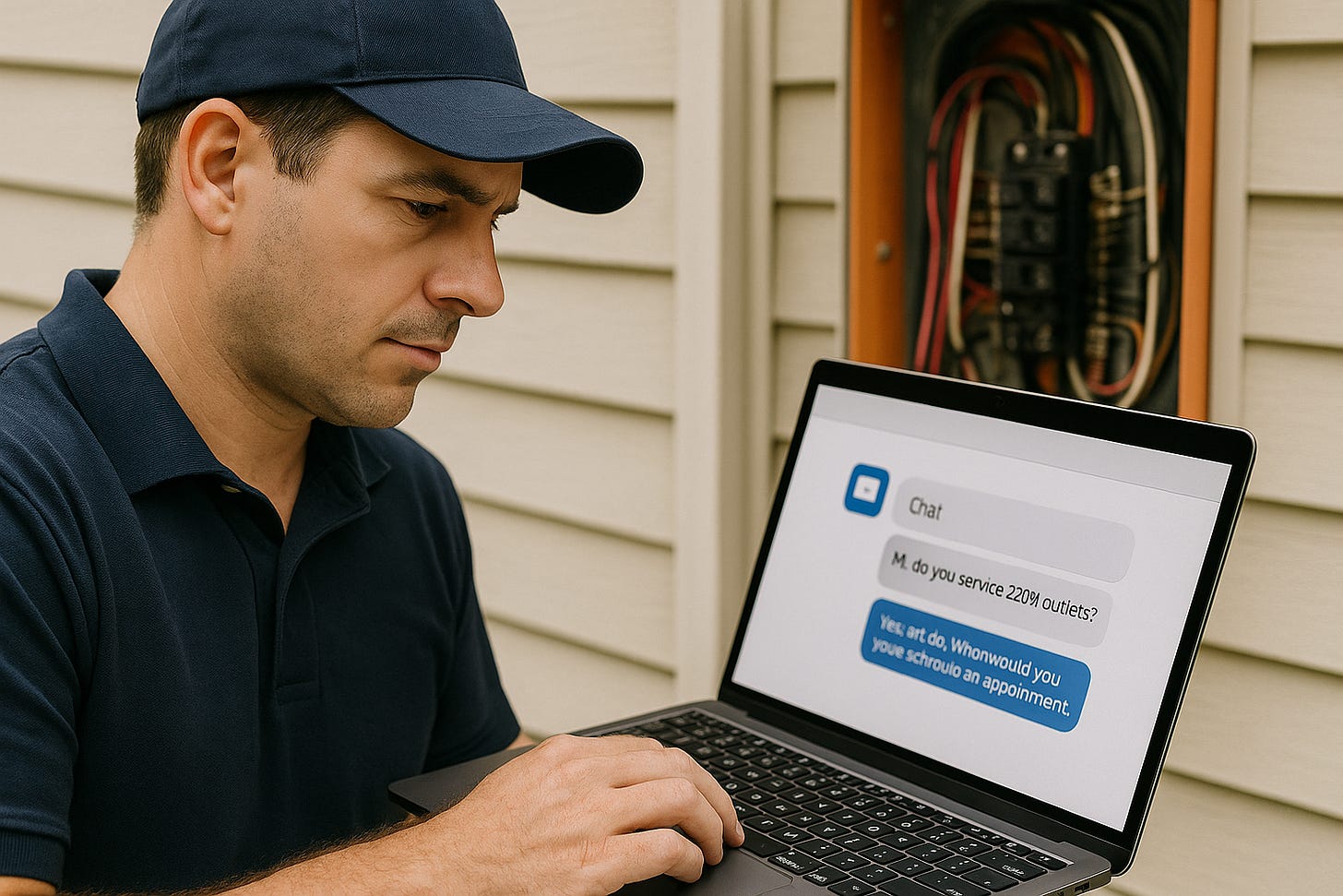 AI chatbots (like Podium, Tidio, or Intercom) can answer customer questions on your website or Google Business page while you’re working. Example: “Do you service 220V outlets?” → Instant answer + booking link.